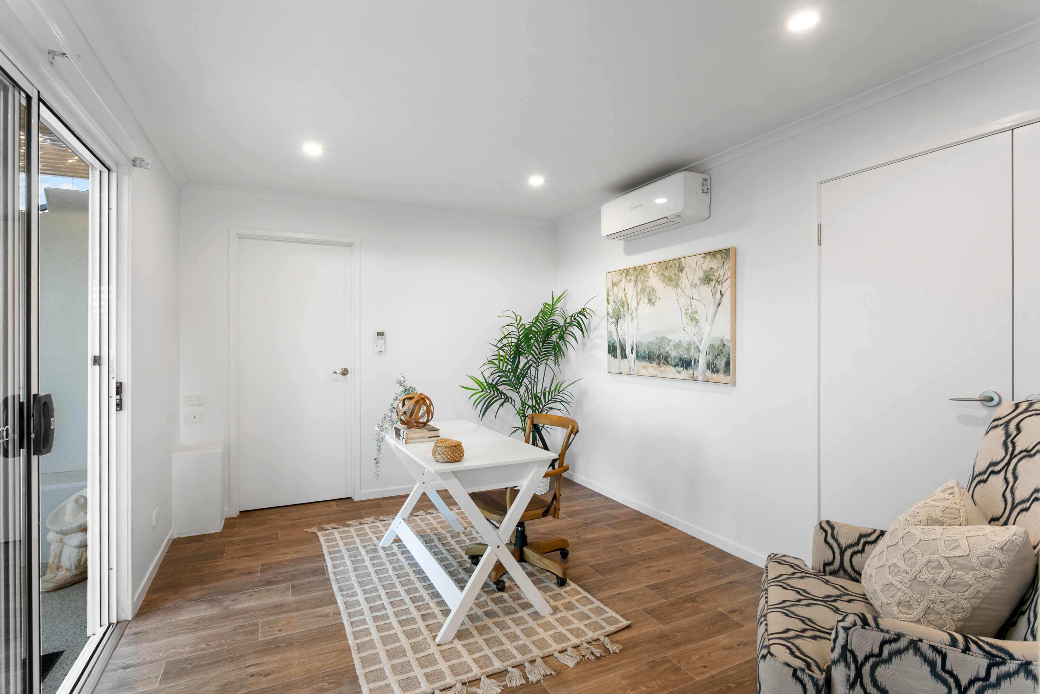 Downstairs features a spacious living area complete with a cozy fireplace and air conditioning to cater for all seasons. The kitchen features an electric cooktop and ample storage space with a large walk in pantry. A separate study provides a space for concentration and productivity with an outlook of greenery through the Georgian framed windows.