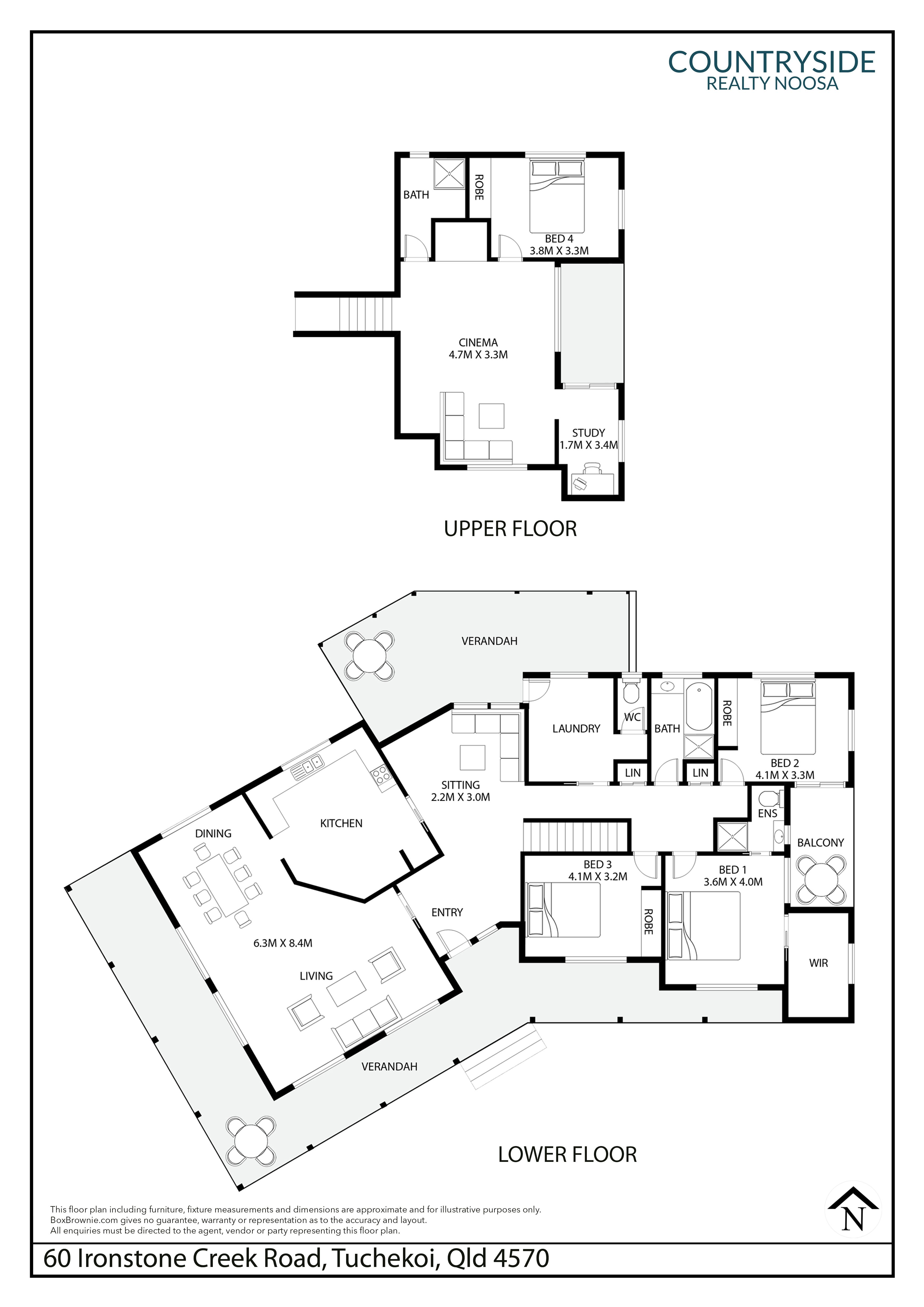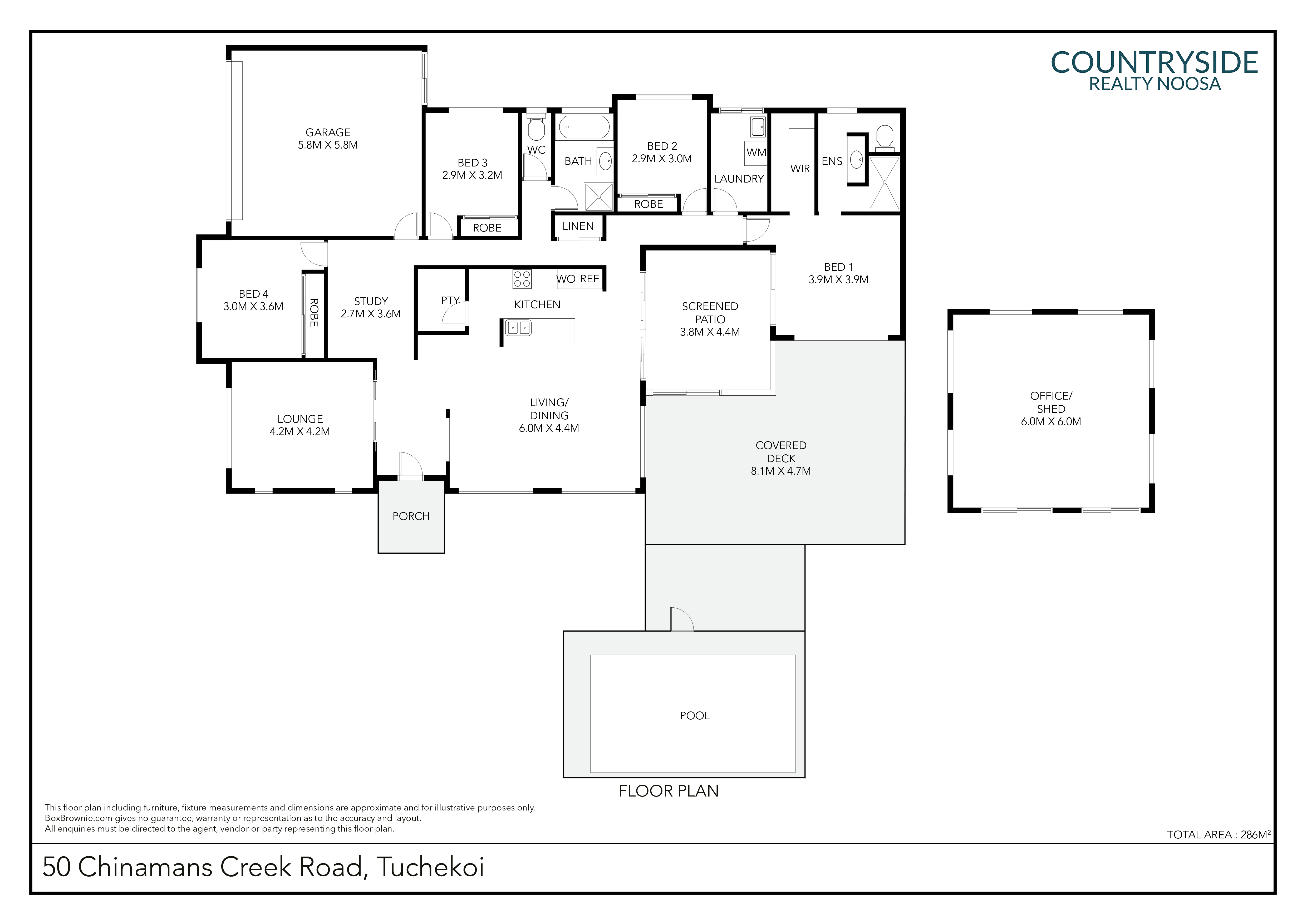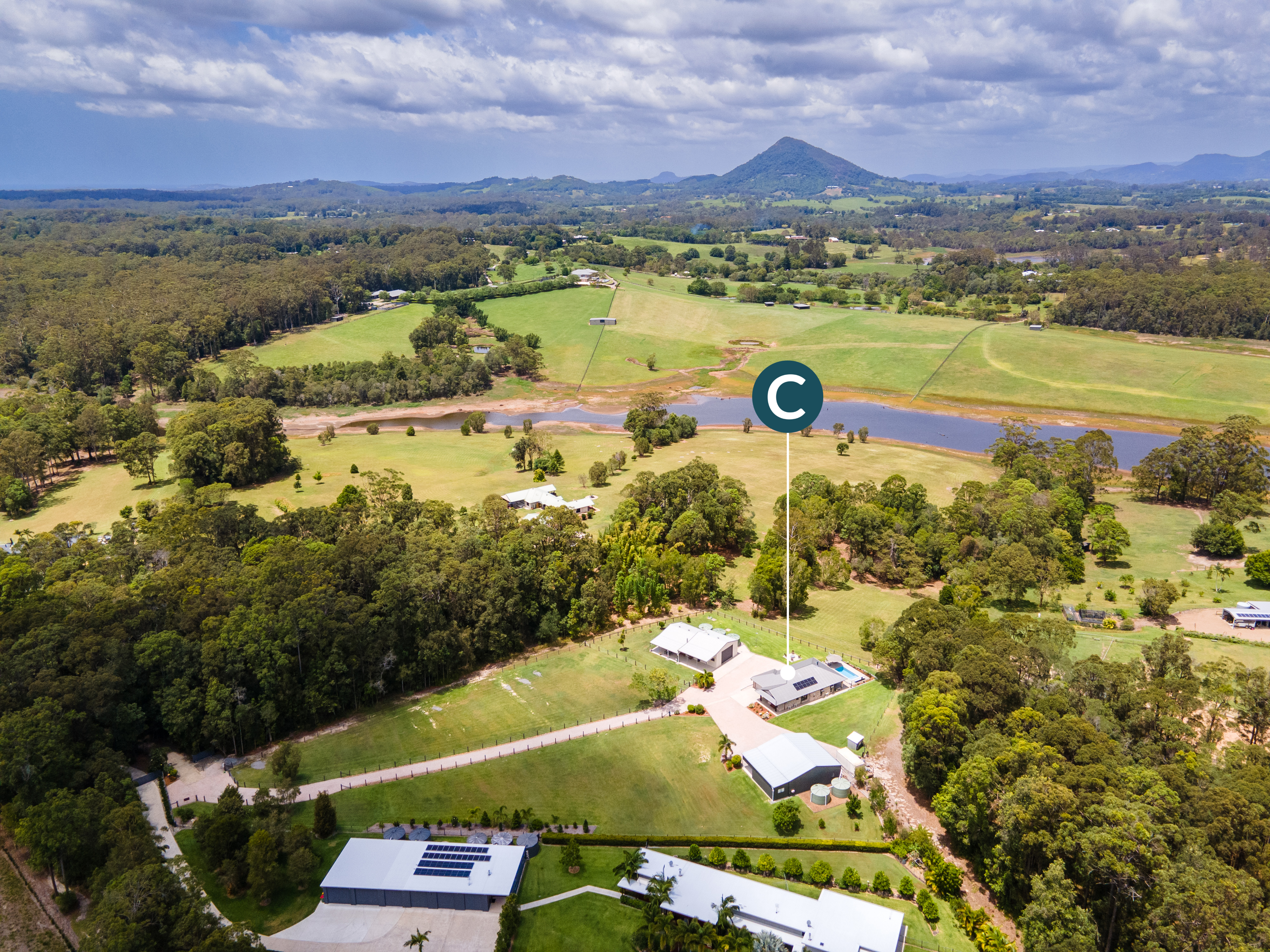 The main residence comprises four bedrooms, two bathrooms, open plan living, light-filled modern kitchen with butler's pantry, front verandah overlooking pool and grounds, north facing uncovered deck, rear patio, and double lock-up garage with storage (under).