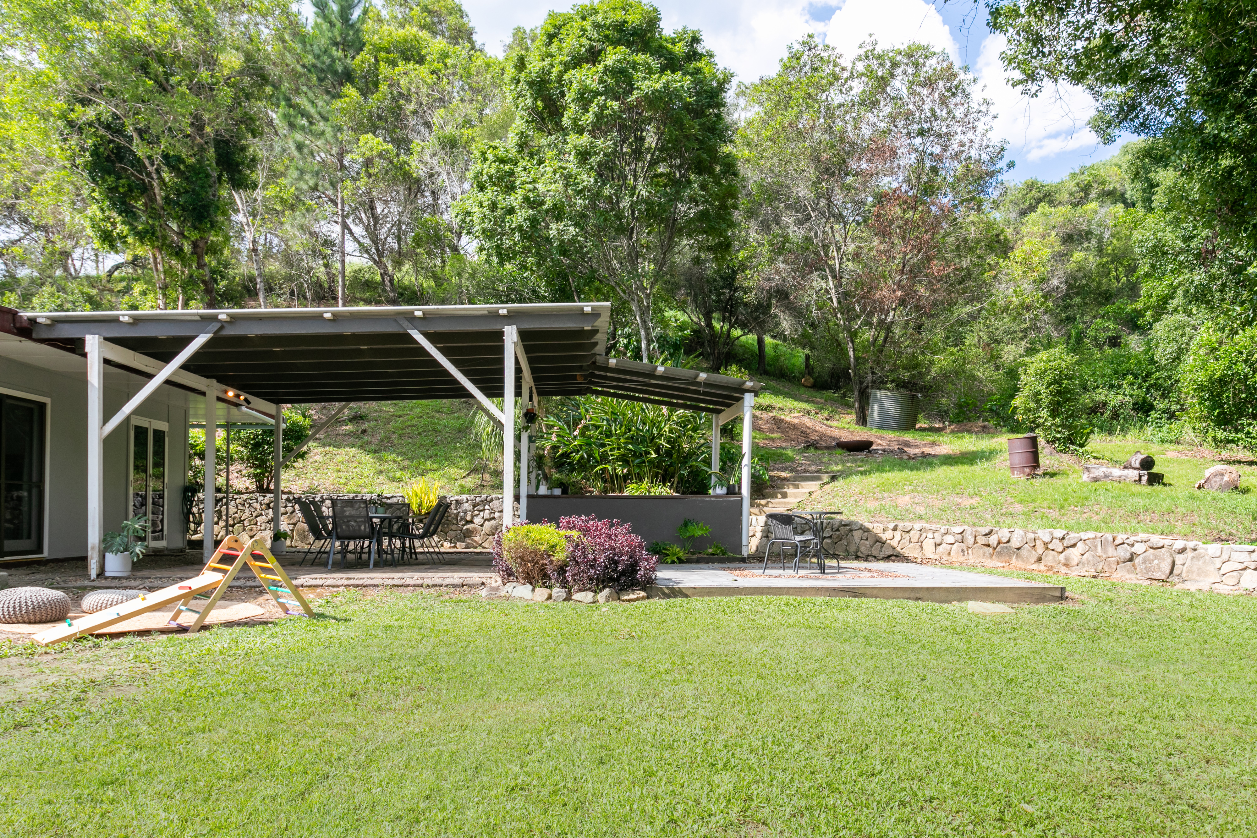 Infrastructure on the property includes full boundary fencing, bore with drinkable water, 4 x 22,000-litre water tanks, septic system, 2-bay 6x4 shed, and 15x8 powered 3-bay shed. There is also a chicken coop onsite for collection of free-range eggs, a delightful children's cubby house, established fruit trees and raised vegetable garden, 2 x firepit areas with seating, and expansive grassy lawn areas for outdoor play.