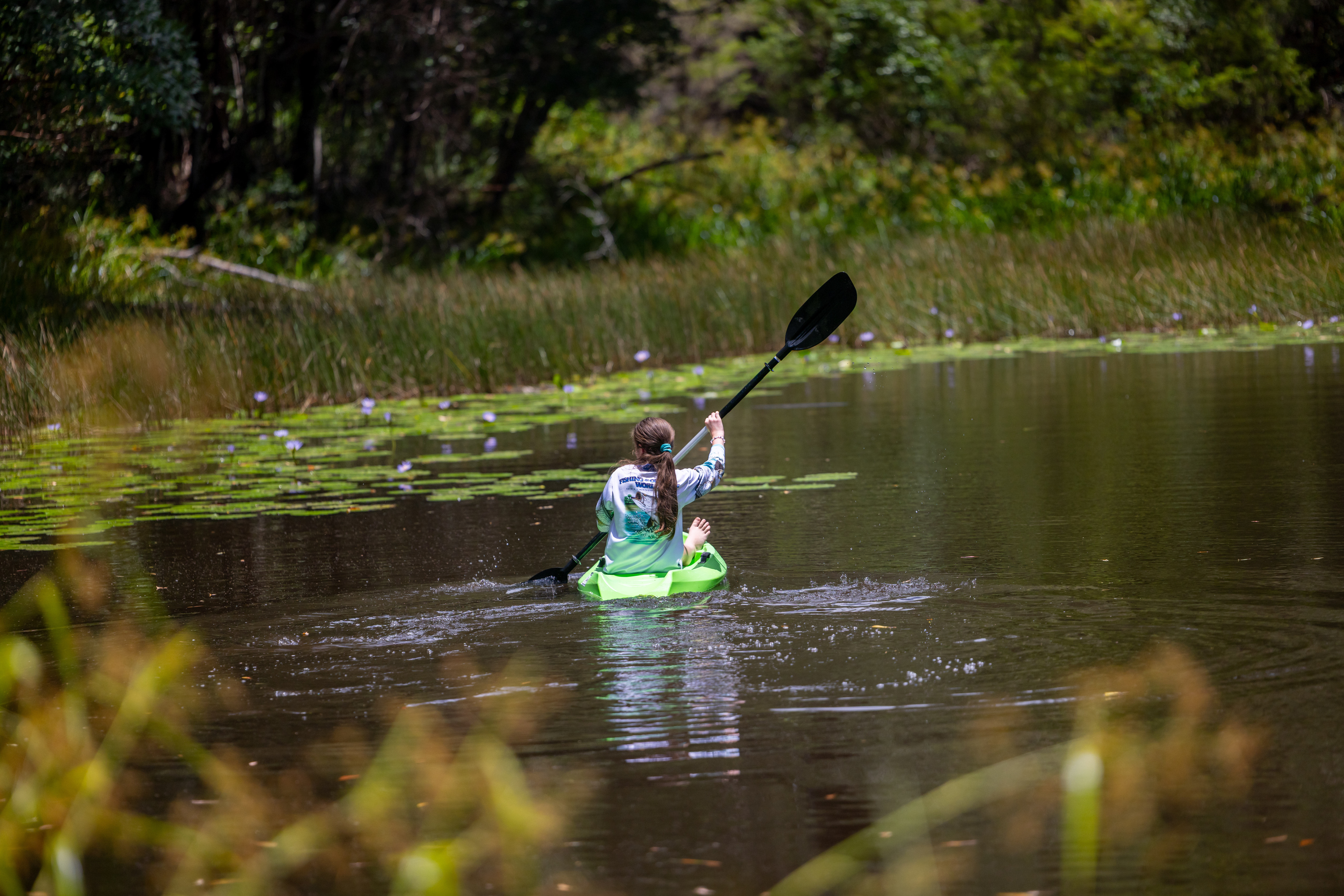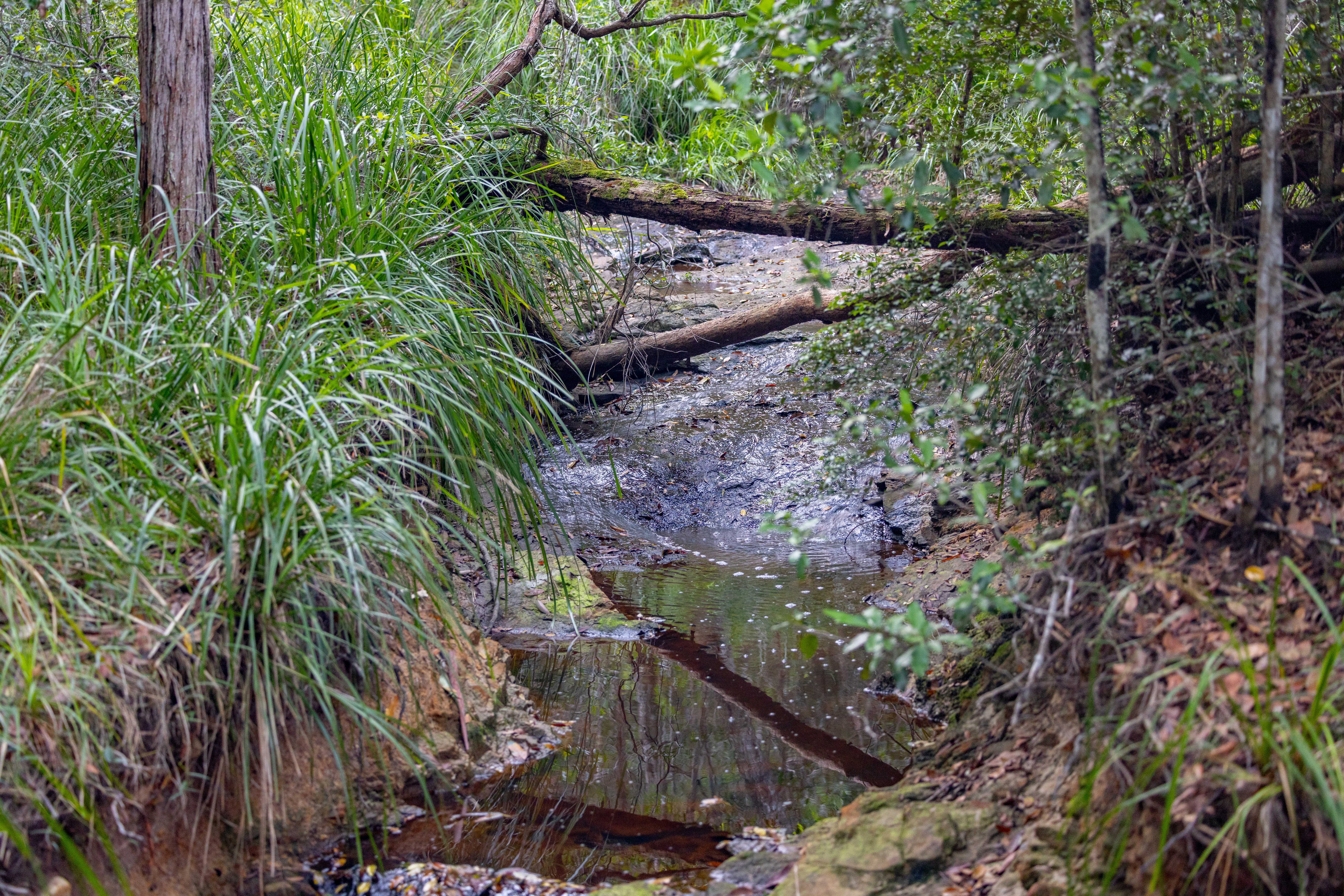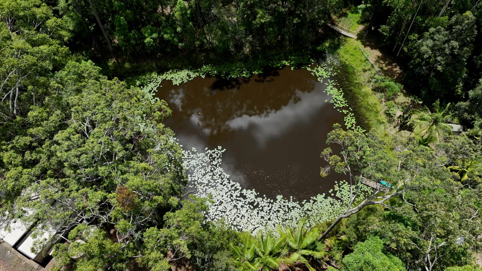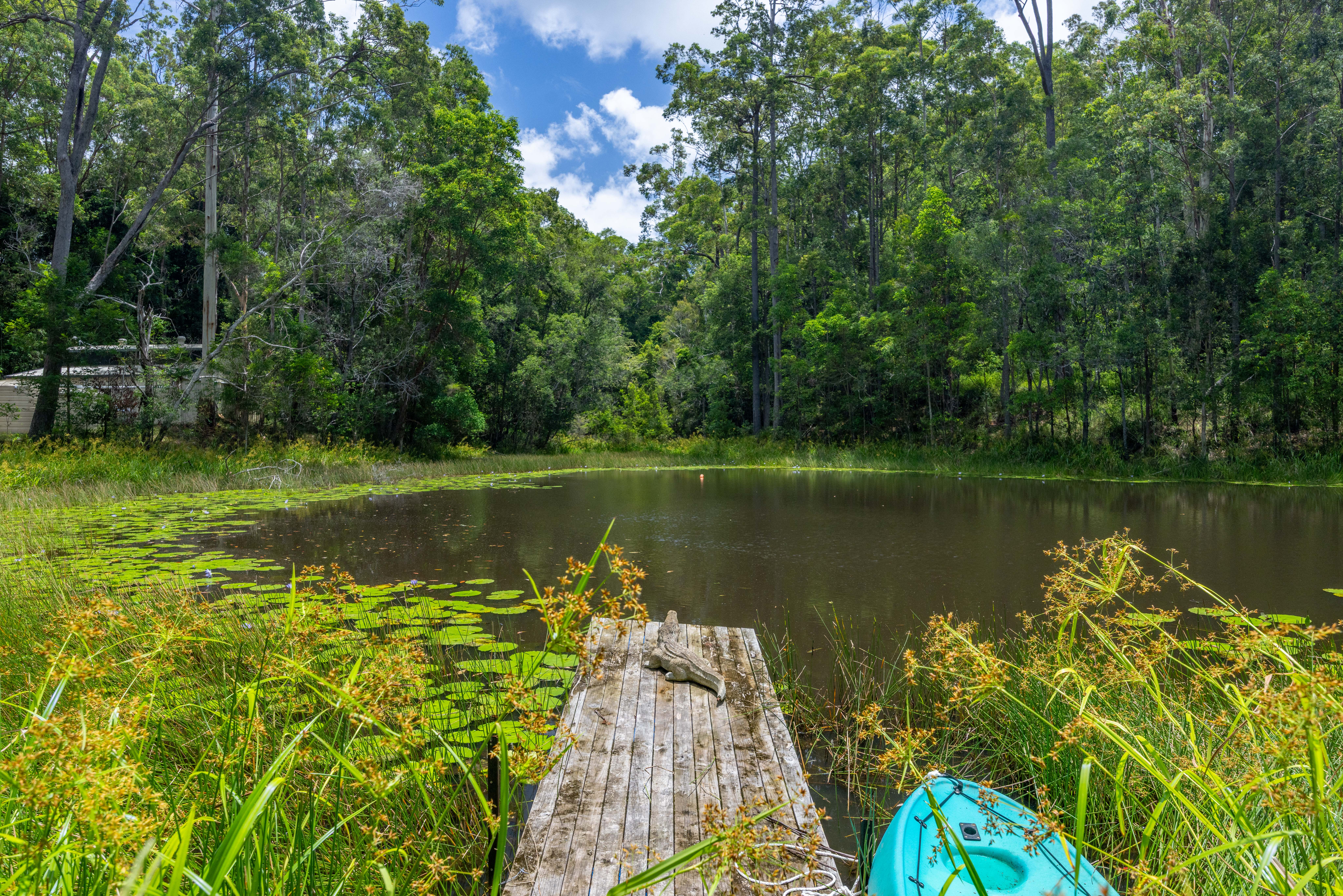• Large dam with floating water lilies, supporting frogs, dragonflies and aquatic life