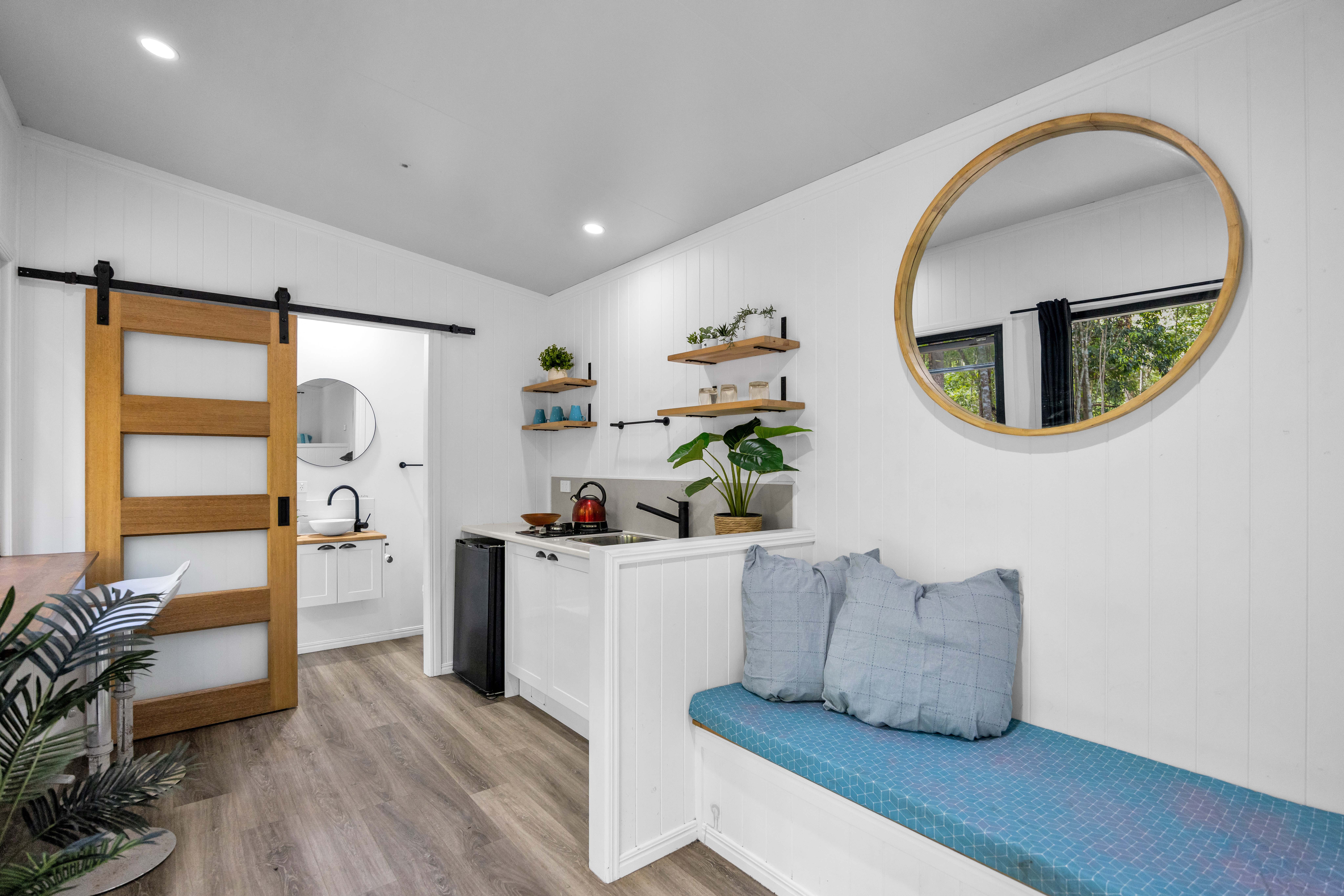 At the centre of the property sits a substantial Glenwood-built residence, complemented by two self-contained tiny homes, a bush cabin, presenting exceptional lifestyle flexibility and income-generating potential.