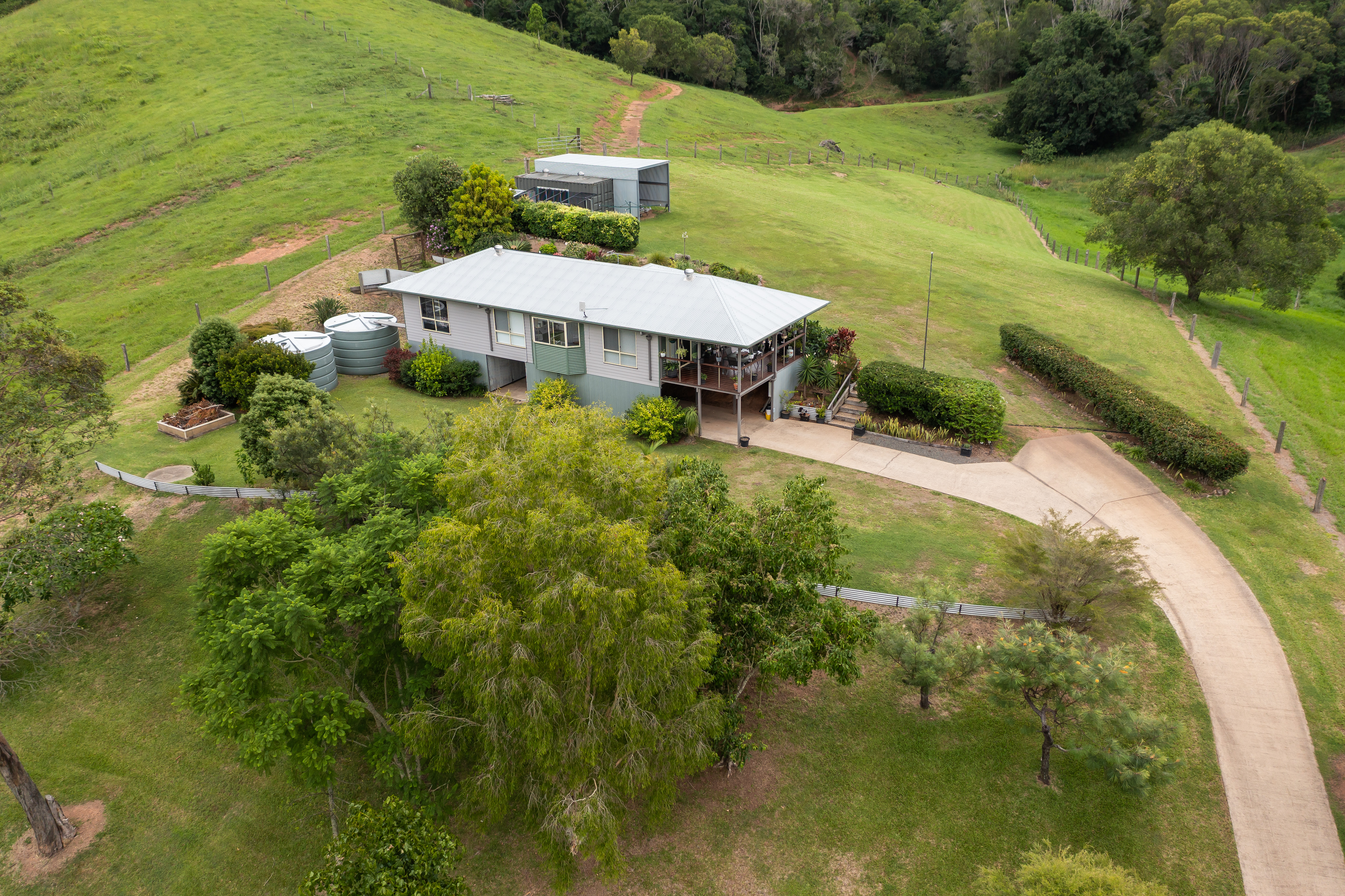 Infrastructure on the property includes farm-gate entry, all-weather concrete driveway, full barbed wire fencing, 2 x rainwater tanks, chook pen, shipping container, and caravan port. There are manicured gardens around the home, and the remainder of the property consists of gently undulating grassy hills.