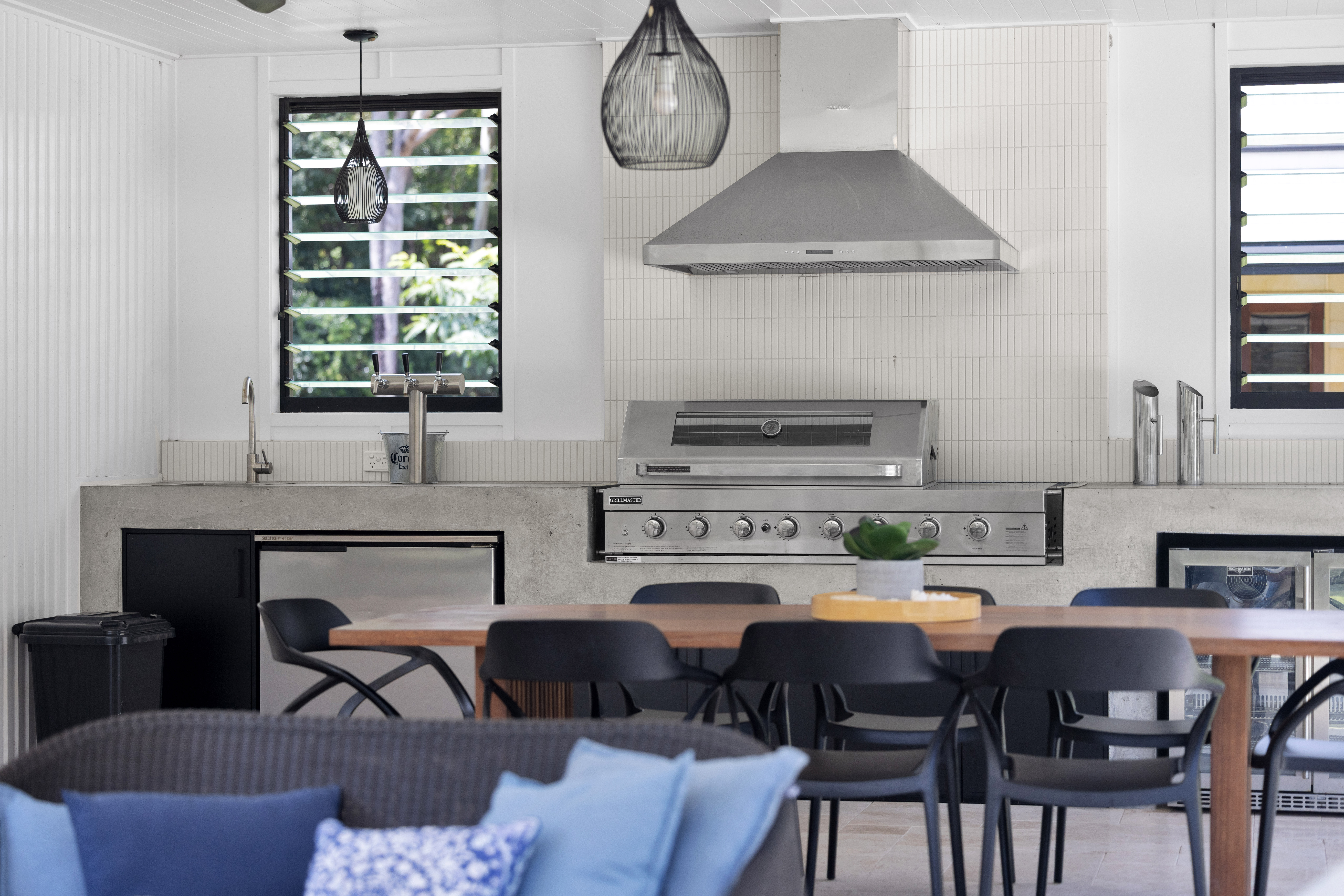 The main residence unfolds across two thoughtfully designed wings. The principal wing comprises three generous bedrooms, three bathrooms, a study or optional fourth bedroom, formal lounge, expansive open-plan living and dining areas, and a premium chef's kitchen appointed for both entertaining and daily living. With the exception of the study, every room opens gracefully onto a wraparound verandah, reinforcing the home's seamless connection to its lush natural surrounds.
