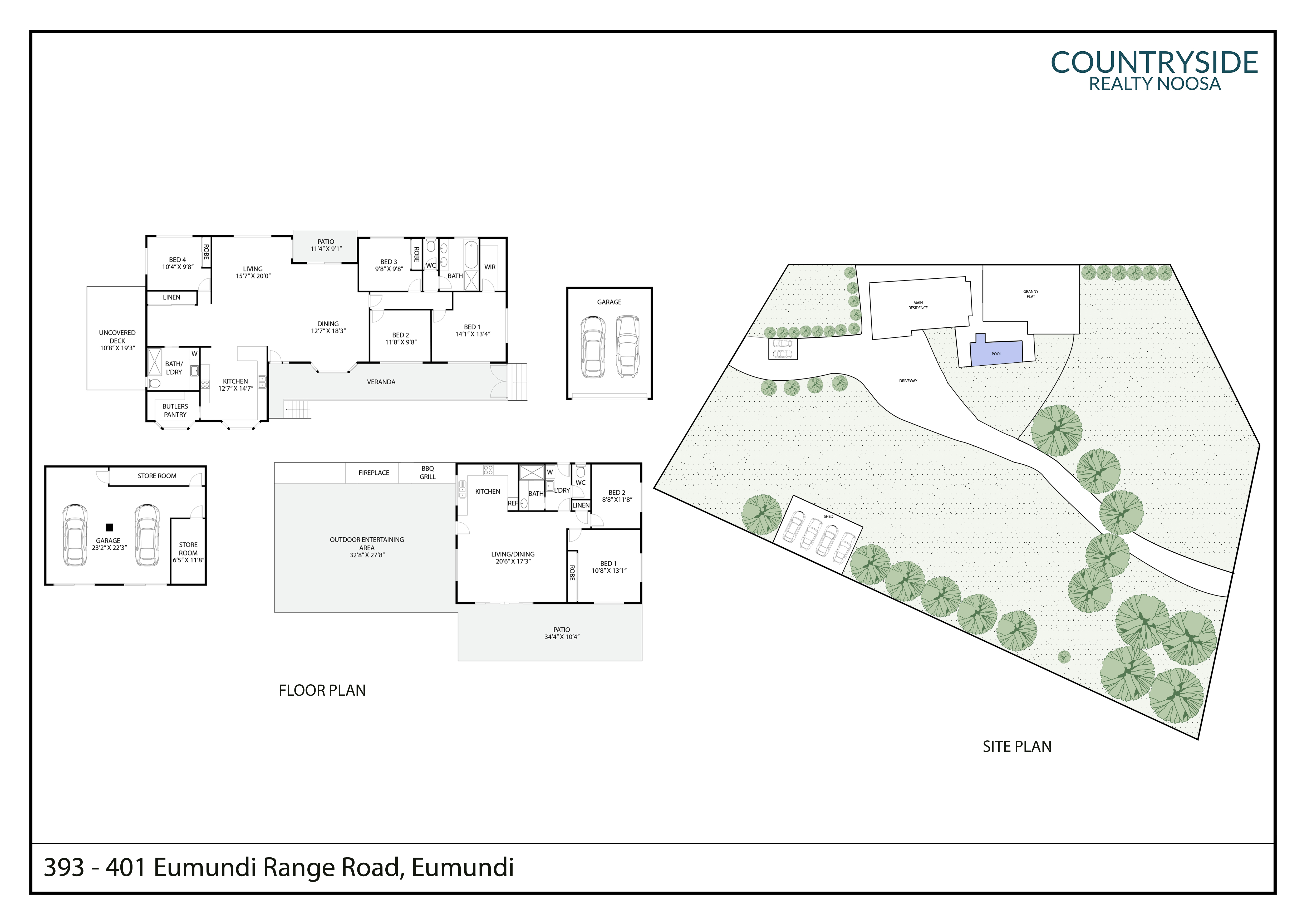 The main residence comprises four bedrooms, two bathrooms, open plan living, light-filled modern kitchen with butler's pantry, front verandah overlooking pool and grounds, north facing uncovered deck, rear patio, and double lock-up garage with storage (under).